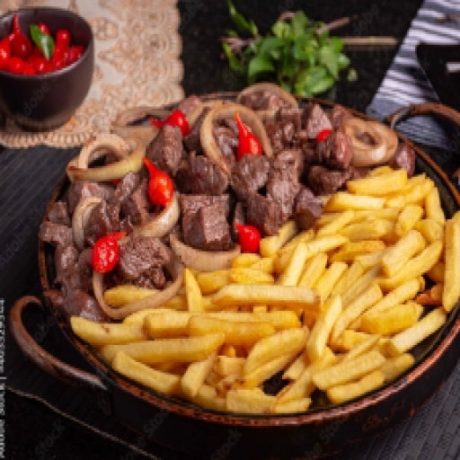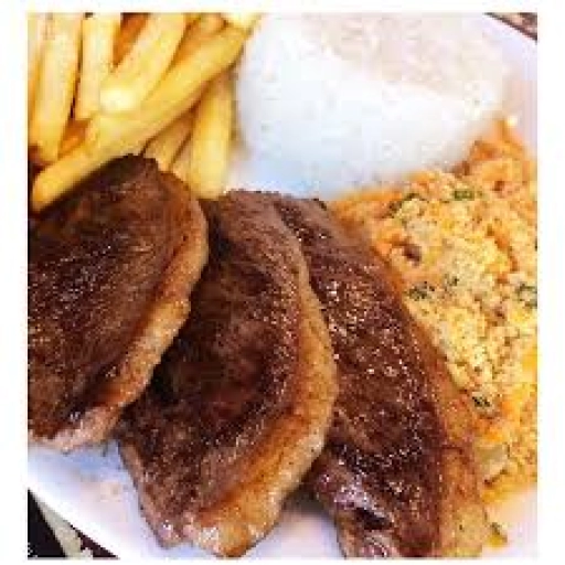 rroz ou baião, feijão tropeiro, farofa, batata frita e salada.